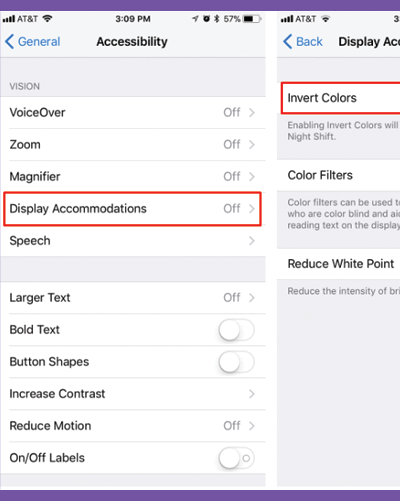 - Pick either Smart Invert (which switches some on-screen colors to Dark Mode) or Classic Invert (which switches all colors).