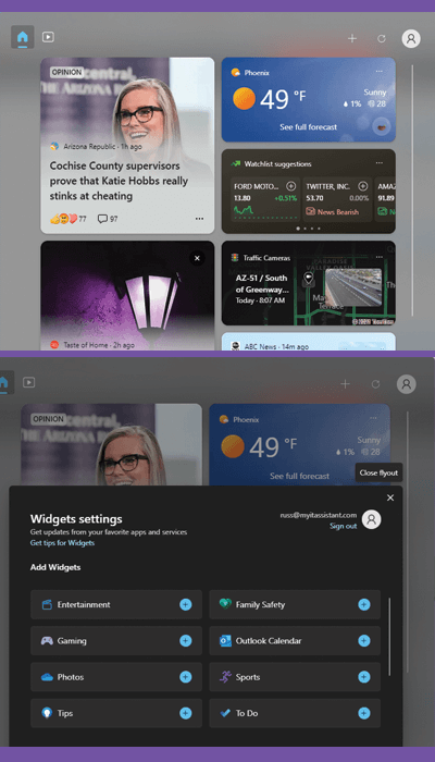 Widgets are mini-apps that are displayed in a small pop-up window when you click the Widgets button in the taskbar.